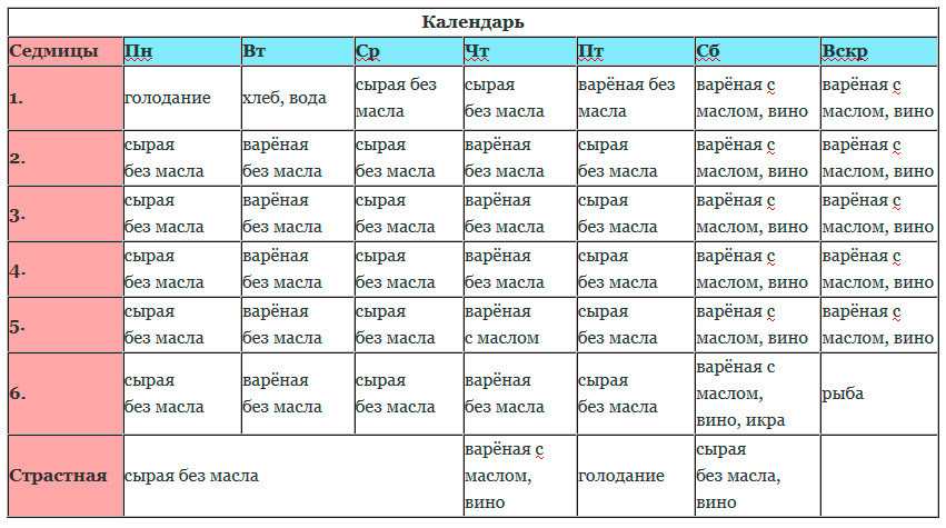 Диета в пост перед Пасхой по дням включает три основных приема пищи, еще 2 или 3 дополнительных. Перекусом может служить 1 фрукт, горсть сухофруктов, несколько ядер орехов или семян, свежие овощи, сладкий бутерброд, стакан киселя или компота.