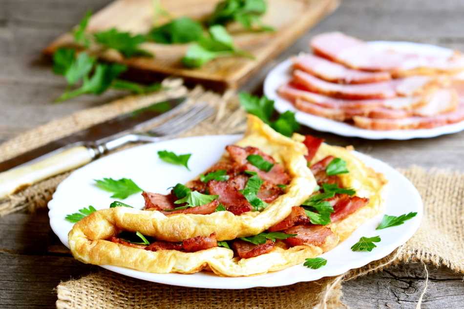 - Обед. Омлет с ветчиной. Зеленый салат из огурца.