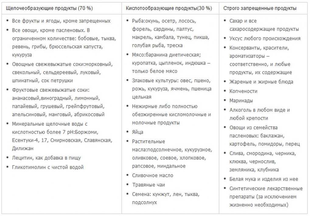 Чтобы правильно составить меню диеты при псориазе, необходимо учитывать главное правило — использовать 65-75% щелочеобразующих и 25-35% кислотообразующих продуктов. Такой подход поможет избежать обострения, вызванного тем, что кислотные реакции преобладают над щелочными.