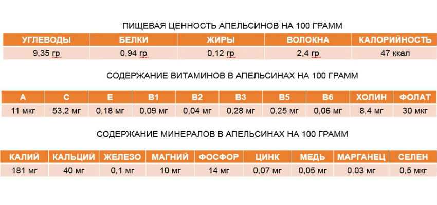 Таблица пищевой ценности и калорийности апельсина на 100 грамм