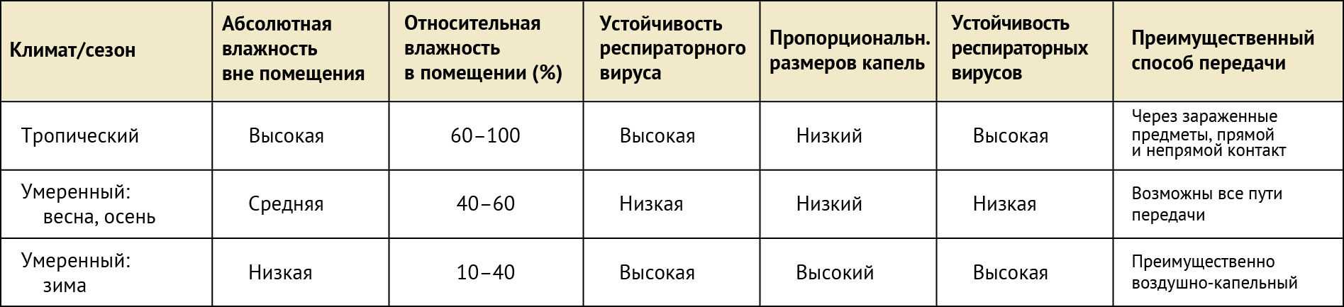 Таким образом, ОВ влияет на все способы передачи, но имеет наиболее выраженное влияние на передачу воздушно-капельным путем. Исследования передачи вируса у животных на морских свинках и хорьках показали, что равновесное состояние при высоком (> 60 %) и низком (< 40 %) уровне ОВ, по-видимому, обеспечивает жизнеспособность вирусов гриппа в капельках, в то время как при промежуточном (40–60 %) уровне ОВ вирусы становятся инактивными (табл. 1). Предполагается, что температура и влажность модулируют жизнеспособность вирусов, влияя на свойства вирусных поверхностных белков и липидные мембраны. Эксперименты на жизнеспособность различных респираторных вирусов проводились в аэрозольных камерах с контролируемой температурой и ОВ. Определенное количество вирусов было распылено в растворе, содержащем соли и белки, а скорость распада вирусов измерялась с помощью анализа осевших частиц. Полученные результаты свидетельствуют о поразительной корреляции стабильности вирусов зимой при низкой ОВ (20–50 %), в то время как при более высокой ОВ (80 %) устойчивость вирусов летом или в течение всего года повышалась. В более ранних исследованиях изучалась жизнеспособность вируса аэрозольного гриппа при различных температурах и ОВ.