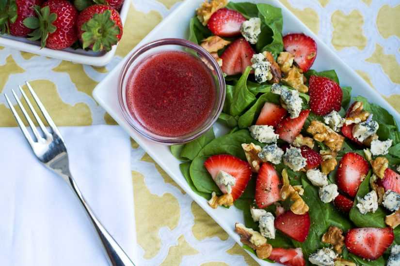 обед – салат из клубники, огурца и отварной курицы с орехами и растительным маслом;