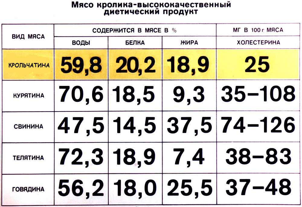 источником белка. В 100 г крольчатины его содержится около 22 г, это больше, чем в мясе других животных. При употреблении этого мяса в пищу человек получает весь набор необходимых аминокислот, в том числе и незаменимые. Биодоступность белка в крольчатине намного выше, чем в других сортах мяса, поэтому оно особенно полезно детям в период активного роста, людям, восстанавливающим здоровье после тяжелых болезней, операций, кровопотерь, в период лечения онкологических заболеваний (лучевая или химиотерапия). Мясо кролика незаменимо в рационе низкокалорийных диет, в том числе соблюдаемых с лечебной целью.