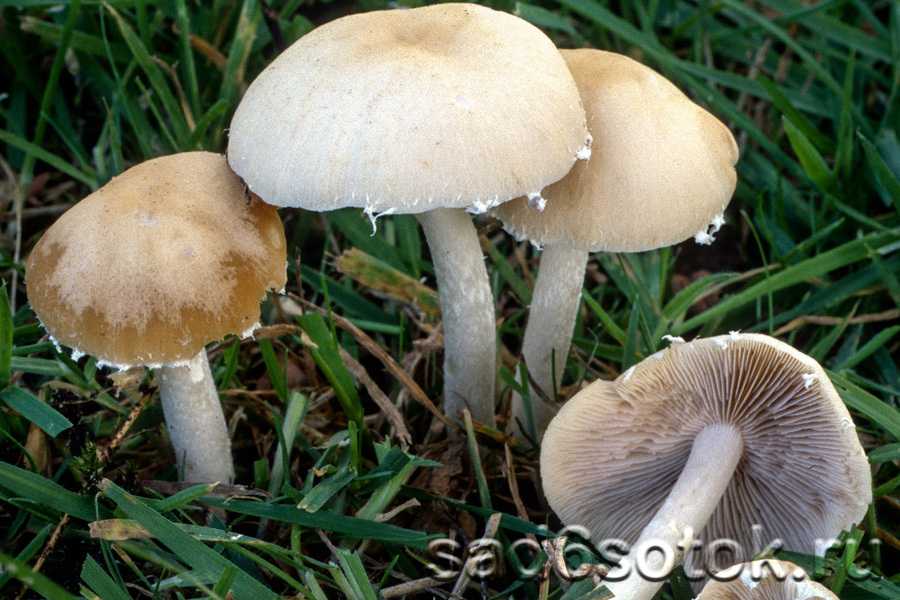Другое название ‒ псатирелла водянистая, и по поводу ее употребления нет единого мнения – иногда гриб считается несъедобным, а в других случаях условно-съедобным. Шляпка диаметром 3–5 см, слегка выпуклая или распростертая, с потрескавшимися истонченными краями. Кожица глянцевая, коричневая, при старении светлеет от цента и становится кремовой, на краях хлопьевидные остатки покрывала. Споры буро-фиолетовые.