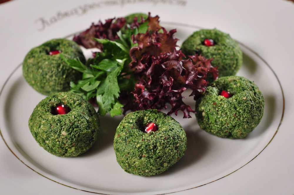 - Из пасты скатываем шарики и предлагаем гостям пхали из фасоли, украсив их кинзой и гранатовыми зернами.
