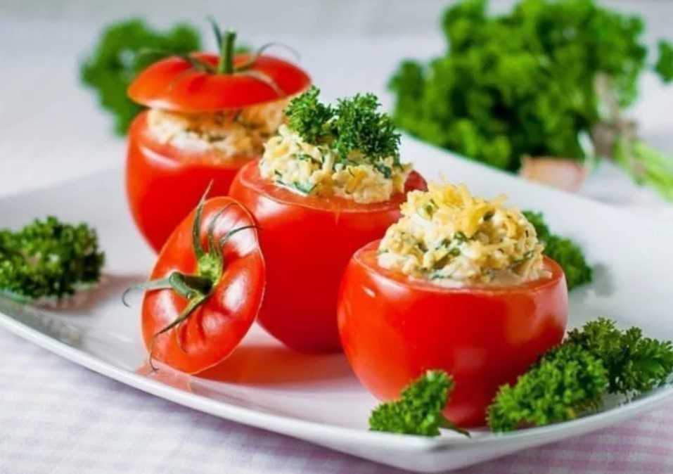 - Готовой массой фаршируют помидоры и прикрывают их срезанной верхушкой.