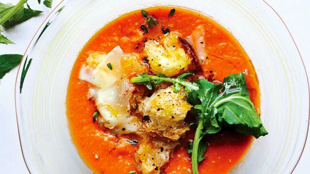 - Разлить готовый томатный суп в пиалы или бульонницы, посыпать сыром и свежим базиликом.