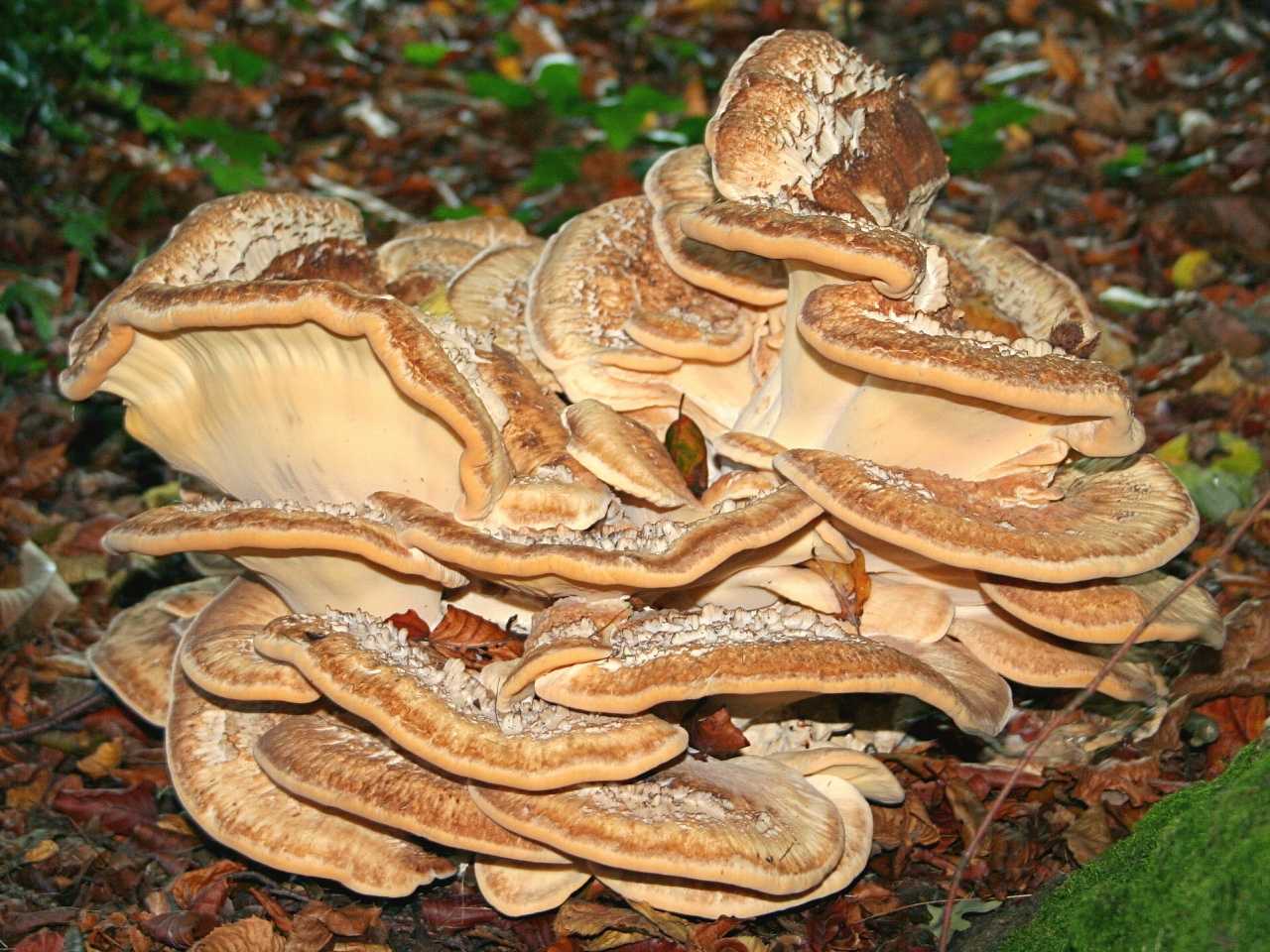 - На кленах, березах, буках и в местах с повышенной влажностью растет трутовик зонтичный. Он выглядит, будто большой букет, сотканный из кружев. Имеет коричневый окрас, окаймленный разноцветными волнистыми полосками: от черного до бежевого, от лимонного до оранжевого. В Китае трутовик зонтичный популярен как съедобный гриб, и его очень часто используют в качестве основного блюда.