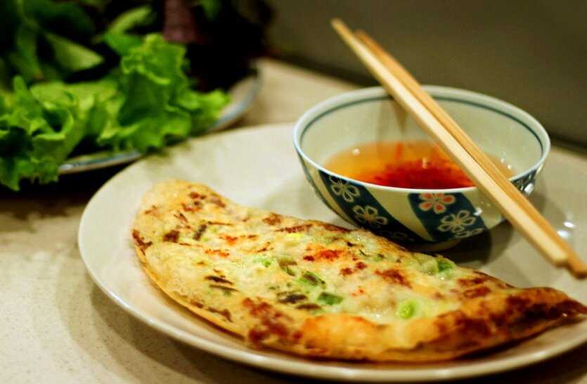 В дословном переводе название блюда звучит как «шипящий блинчик», потому что во время приготовления он издает характерный громкий звук. Его готовят из рисовой муки с куркумой, а в качестве начинки используют мясо, креветки, бобы, лапшу, ростки фасоли или что-то еще. Это блюдо во Вьетнаме можно кушать вегетарианцам, так как овощные наполнители очень популярны. Блинчики жарятся в большом количестве масла, а подавать их принято с большим количеством зелени, чтобы немного приглушить жирность.