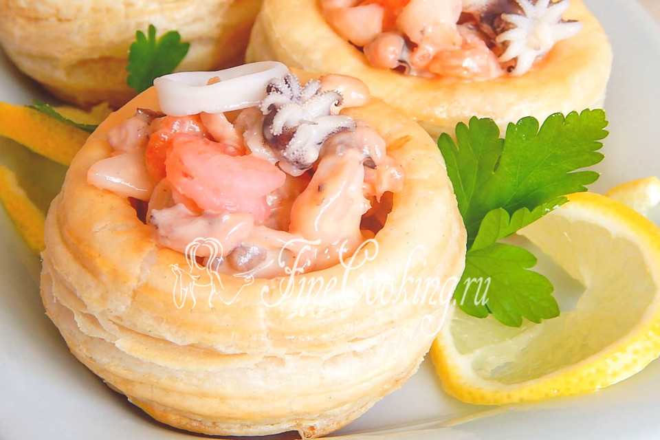 Предлагаю пополнить коллекцию рецептов оригинальных закусок — будем готовить волованы с морепродуктами. Волованы — это башенки, начиненные мясным, рыбным или грибным рагу. Кстати, это также могут быть сами изделия на основе слоеного теста, но без начинки.