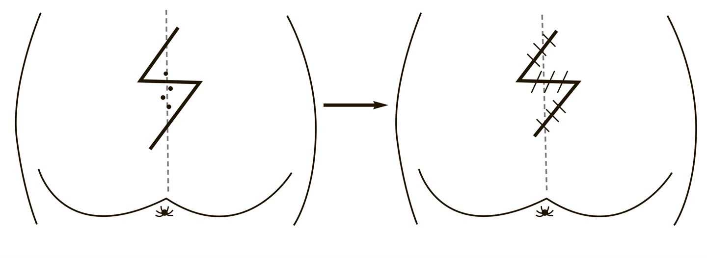 При развитии воспалительной реакции, чему обычно предшествует закупорка наружного отверстия, эпителиальный копчиковый ход сначала проявляется болезненным уплотнением на коже в области межъягодичной складки (важно знать, что иногда, особенно при длительном отсутствии адекватного лечения, свищевые ходы могут приобретать причудливые формы и появляться за пределами указанной области (рис. 2)