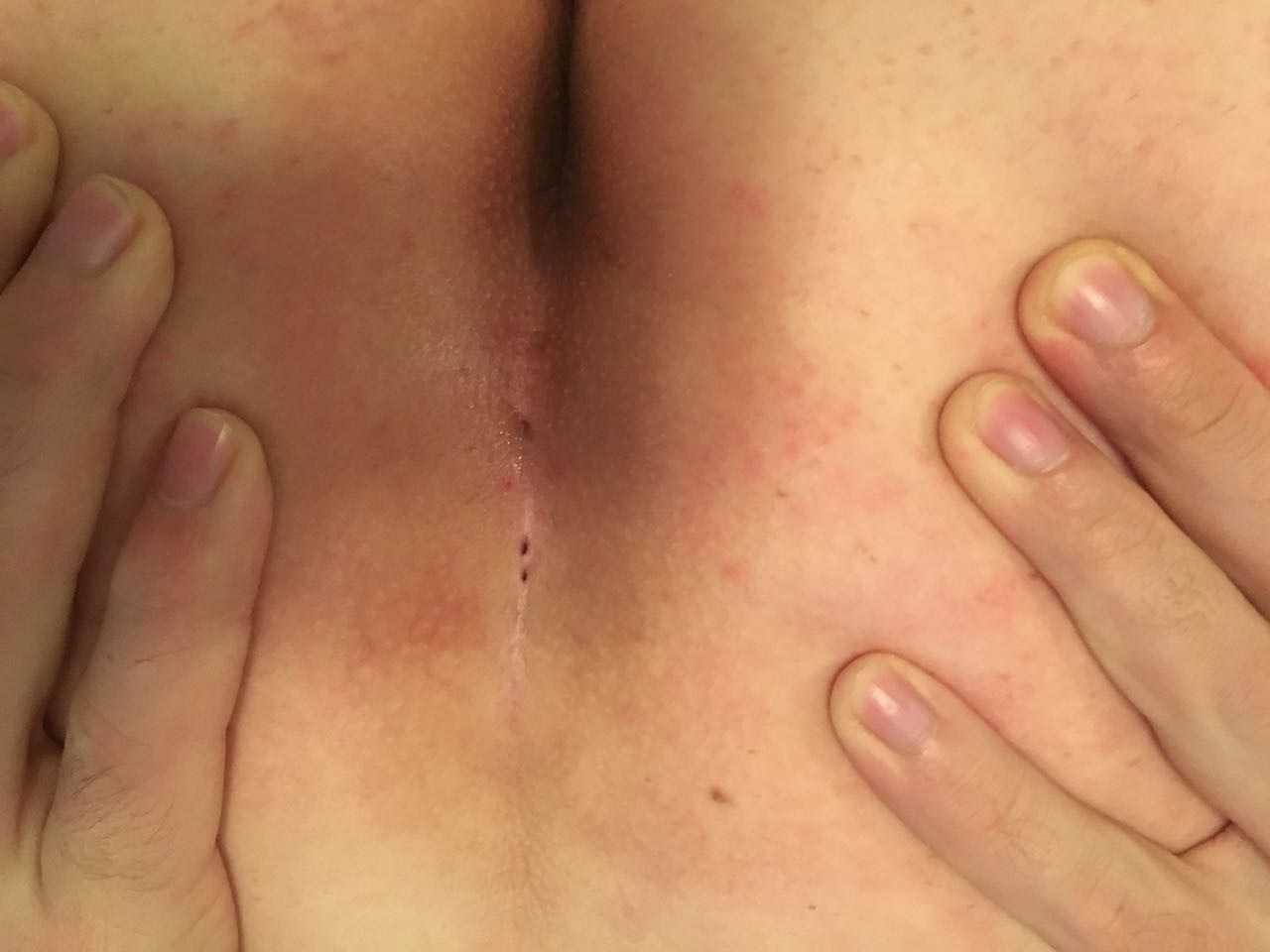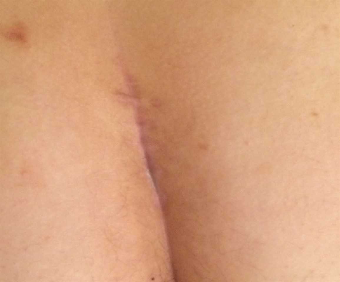 б) вид раны после иссечения ЭКХ с последующим выполнением пластики кожно-фасциальными лоскутами (наложены единичные узловые швы на рану. Послеоперационный рубец расположен в межъягодичной борозде, что обеспечивает хороший косметический эффект)