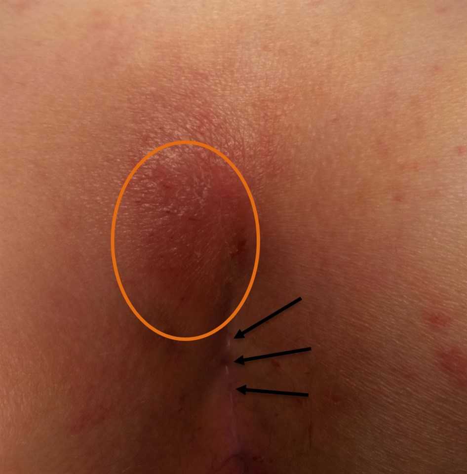 Рисунок 4. Абсцесс эпителиального копчикового хода (стрелками указаны первичные отверстия, расположенные в межъягодичной складке. Область предполагаемого абсцесса ограничена оранжевой линией)