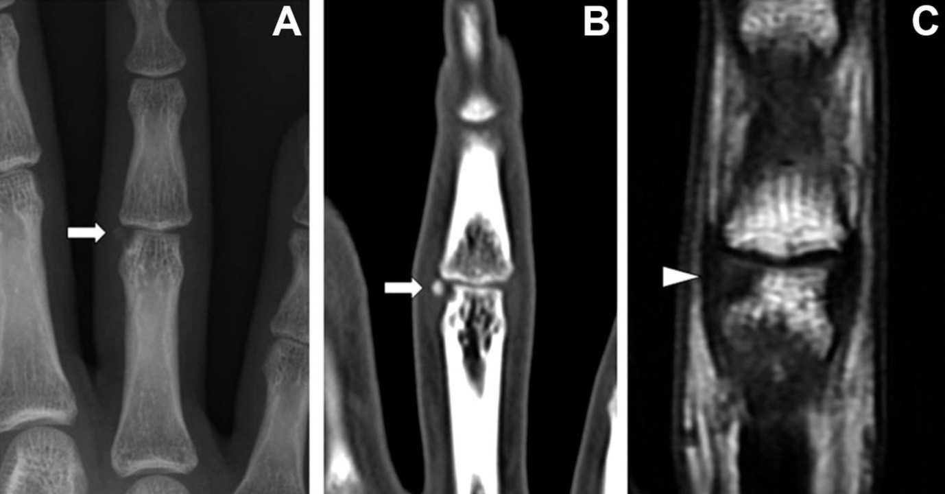 Сравнение рентгена, КT и МРТ безымянного пальца. Рентгеновский снимок (A), КТ (B) и МРТ (С). Фото: Case Reports in Plastic Surgery and Hand Surgery / ResearchGate (Creative Commons Attribution-NonCommercial 4.0 International license)