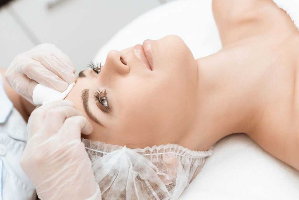 Сначала врач удаляет с помощью мягкого косметического средства остатки макияжа, пот, поверхностные загрязнения.