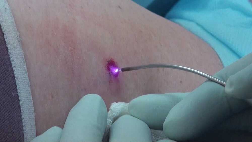 Чтобы удалить новообразование, интенсивный пучок света пропускается через поврежденные ткани. Обычно процедура проводится под местной анестезией, поэтому пациенты практически не испытывают дискомфорта. Операция занимает несколько минут.