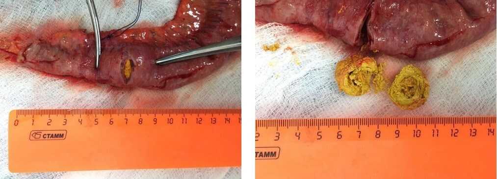 На фотографиях в просвете резецированного участка тонкой кишки находится конкремент, вызвавший кишечную непроходимость.