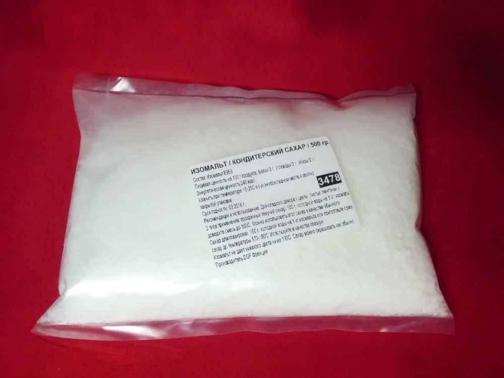Изомальт, или добавка Е953 — это низкокалорийный углевод, который применяется в кондитерском деле вместо сахара при приготовлении десертов. Выглядит, как белый кристаллический порошок, легко растворяется в жидкости и не имеет запаха, но обладает сладким привкусом.